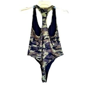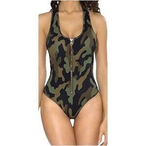 NWOT Petal Dew Swimsuit Bodysuit in XL features a stylish camouflage pattern, racerback design, and front zip closure for a comfortable and flattering fit. Made from a blend of nylon and spandex, this one-piece swimsuit is perfect for beach, sporty, or pool activities, offering stretch and lining for added comfort. With its cheeky swim bottom style, this green bodysuit is ideal for women looking for a chic and practical swimwear option.