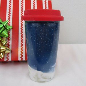 Brand new, never used double wall ceramic Christmas Travel mug from Pier 1. Heavy weight ceramic with silicone lid for sipping. 6 inches tall. Nice gift or stocking stuffer.
