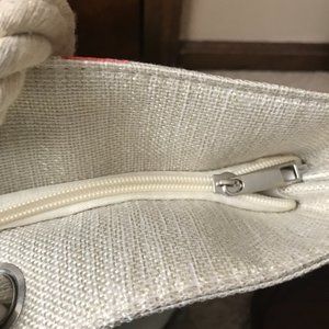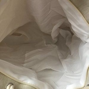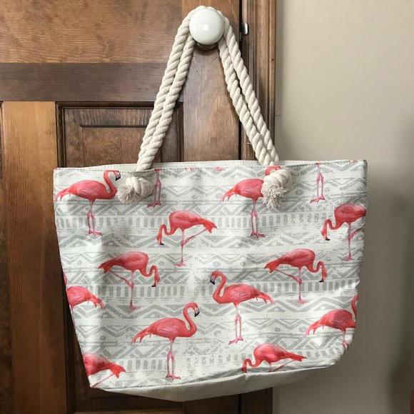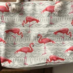New without Tags; Tote Bag; Pearl and Gray Fabric with Pink Flamingos; Thick Double Rope Handles; Zipper Close; White Fabric Lining; Interior Back Wall: Slip Pocket; Handle Drop 9 inches; Measurements: 22 inches x 7 inches x 15 inches