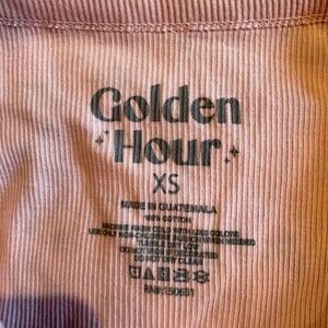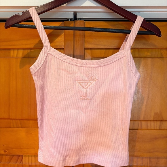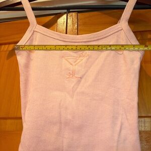 NWOT, never worn or washed. Still has the little inspection stickers inside. Cropped, ribbed, 100% cotton, pink tank top with an embroidered martini glass on it. This an XS and definitely petite so please look at the measurements. Golden Hour brand. The color is a little lighter than the main photo. Measurements are approximate