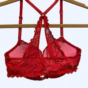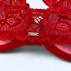 Pink Victoria's secret red lace balconette padded bra and clasp in front. Like new perfect condition. Lace in the back. 32D or 34C