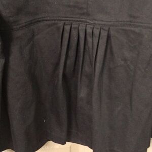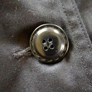 V neck, three large size buttons down front, two lower front pockets, small waistband above pleated front near pockets, front small band along bustline, pleats in the lower back, adjustable belt on each end of sleeves