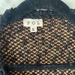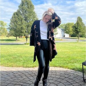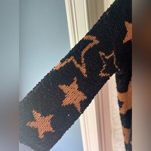 Super soft, new without tags, black with camel brown stars. Relaxed fit. Front falls in a waterfall drape. 80% polyester, 20% acrylic. Really nice weight and thickness. (BIN17