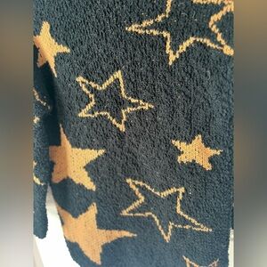 Super soft, new without tags, black with camel brown stars. Relaxed fit. Front falls in a waterfall drape. 80% polyester, 20% acrylic. Really nice weight and thickness. (BIN17