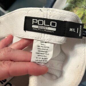 The product is a rare NWOT Polo Sport Ralph Lauren white cap hat in size medium to large. Made of polyester twill fabric, this baseball cap features the iconic Polo Ralph Lauren logo on the front. Perfect for casual occasions in the summer, fall, or spring, this hat is a stylish accessory for men who appreciate quality and classic design from a renowned brand. Made in China, this hat is a must-have for fans of sports-themed headwear.