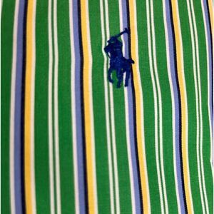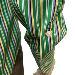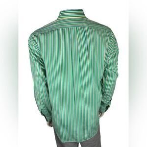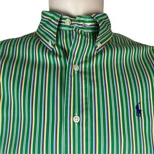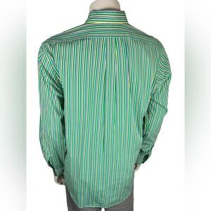 Super cheerful striped L/S button down by Ralph Lauren in Kelly green, white, yellow, light blue and navy vertical stripes. New without tags, 100% cotton, and size XL, which measures: