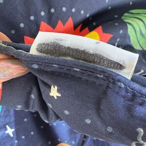 This is a new without tag, open box item. The comforter is no longer available in this size/pattern. Inspire stellar adventures with the Pottery Barn Kids Solar System comforter which has glow-in-the-dark details. Made with comfortable organic cotton percale. The tag has been removed, but it is a full/queen size, measuring approximately 90" wide x 88" long. This also comes with a complimentary jumbo space saver bag, which is perfect for storing this, or other blankets and bedding.