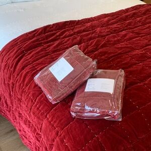 Pottery Barn full/queen Luxurious velvet quilt in rich merlot. Handcrafted with box stitch design. Perfect for Christmas, it is a beautiful set very well made, quality that will last for years. 2 Euro shame included. Planned to use so some tags have been removed but never did use
