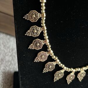 New without tags but in original bag. Measures approximately 14-18 inches with additional charmed extender. Necklace can be worn both ways, pendants have stones on one side and plain on the other. Gorgeous gold toned piece!