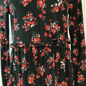 NWOT Primark Cares Floral Dress in size 6. Super soft fabric is 92% polyester and 8% elastane. Long sleeve, crew neck with ruffle at waist. Black with floral pattern in shades of red, green and white. Please see photos for approximate measurements and details. Excellent new condition from smoke free and pet free home.