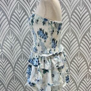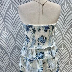 Chic strapless dress with blue floral pattern. Features ruffled layers and a fitted bodice. Perfect for summer outings. Partial tag removed by outlet that receives donated items from PP. Photo from PP is for reference only.