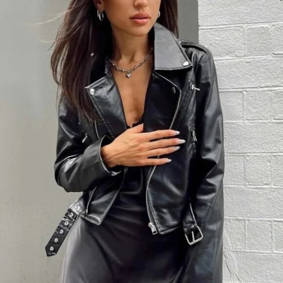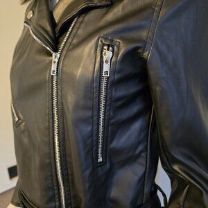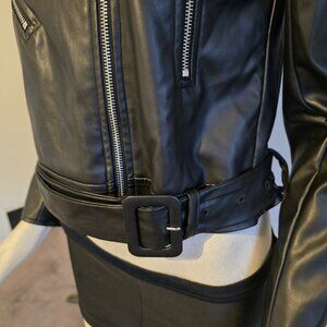Great looking Princess Polly moto jacket with lots of detail... adjusted.belted waist, front zipper closure, zippers on chest and sleeves, snap detail on collar and fully lined