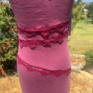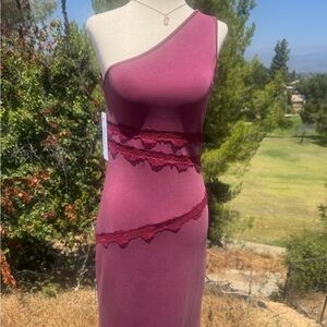 Chic one-shoulder dress in plum. Features lace accents for added elegance. Perfect for special occasions.