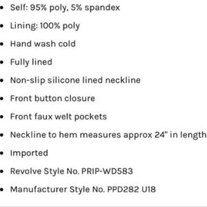 Self: 95% poly, 5% spandex.Lining: 100% poly. Hand wash cold. Fully lined. Non-slip silicone lined neckline. Front button closure. Front faux welt pockets. Neckline to hem measures approx 24" in length.