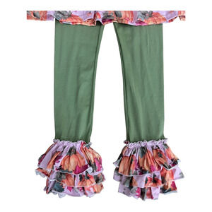 Celebrate the fullness of the season with this adorable outfit featuring an abundance of ruffles at the chest, cuffs and ankles, lots of pumpkins and colorful leaves on the pinkish top and green leggings.