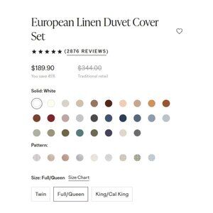 This is for one Full/Queen white linen Duvet set with two shams. The duvet an overstock item. There is no evidence of use, stains, tears, etc. Please note that the item will have some wrinkles since it is linen and has been stored. It has the original Quince bag. Original retail on Quine site is $189.