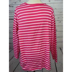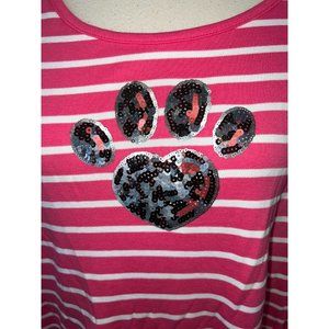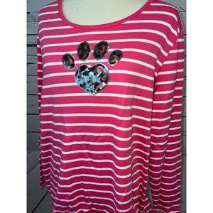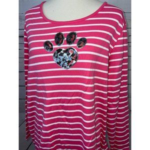 NWOT Quacker Factory Long sleeve Shirt Plus Size 1X. Pink and white stripe design, crew collar. Silver and pink sequin paw print on front is perfect for the cat lady or dog lover / mom. Made in China. 60% Cotton 40% Polyester Machine washable. Pit to end of sleeve 17", shoulder to end of sleeve 23.5", pit to pit 25", back bottom of collar to bottom of top 27". Color is crayola carnation pink. Great new without tags condition makes a perfect gift.