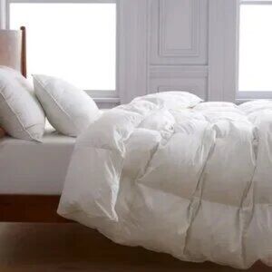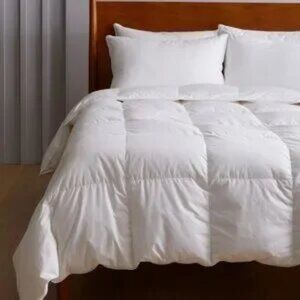 Quince premium down alternative all season comforter, featuring a hypoallergenic microfiber fill that mimics the feel and warmth of a luxury down and a baffle box construction to prevent fill shifting. Catalog returns overstock. New in packaging. New without tags.