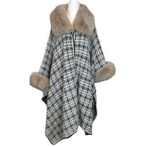 This NWOT R Fashion Apparels Plaid Print Faux Fur Cape is a stylish and versatile piece perfect for a party or cocktail event. Made of polyester with a check pattern and accented with faux fur trim, this mid-length cape features long sleeves and a relaxed fit. The ivory color and oversized style make it a classic and on-trend choice for the winter and fall seasons. Hand wash only to ensure garment care, this lightweight cape is a must-have in any woman's wardrobe for a touch of holiday glamor or old money vibe.