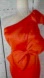 Stunning body con gown with a large bow at waist. On shoulder design with floral petal cap sleeve detail. Zips in back Poly stretch fabric color reddish orange.
