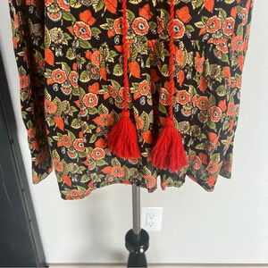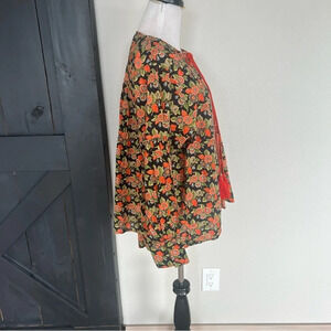 Black/ orange floral print split neck peasant with quilted accent on bodice/ shoulders/ cuff from Rhode Resort. tassel tie trim on split neck, button cuff. 100% cotton. made in India.