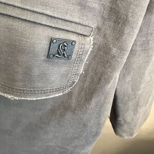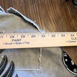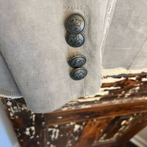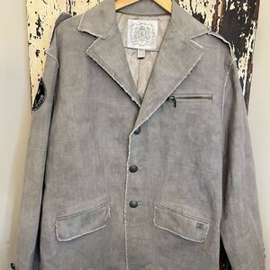 No flaws. From smoke free home. Nicely lined and cool buttons. Raw hem jacket. Bundle and save.