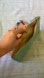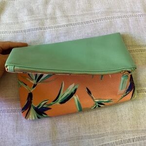The lightening makes the bag look more green when it’s really a soft teal. Tropical print. Purse folds out and has a fun tassel on the end of zipper. Never been used! Small imperfection on the back (please see photo/video) very minor! A great clutch for a night out or for a special occasion.