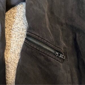 60% lyocell, 40% linen. Front zipper closure. Side zipper pockets. Zipper cuffs.