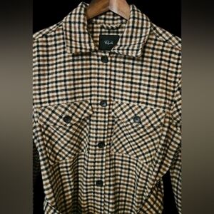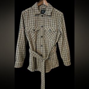 Featuring light sand brown and rich mocha plaid design, self-fabric belt, oversized fit, flap pockets at chest, and dark horn buttons.