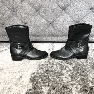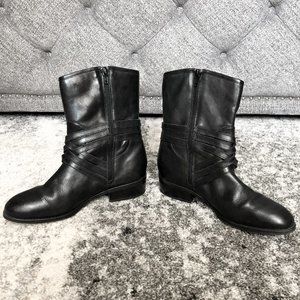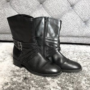 These black leather boots are brand new and gorgeous (just a little small for me, they were a gift). Rock them with jeans, or black leggings and a dress -- perfect for upcoming autumn weather! Timeless luxury classic.