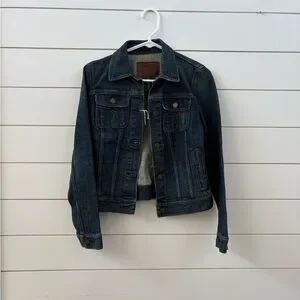 Stylish dark blue jean jacket. Features classic button front. Ideal for layering.