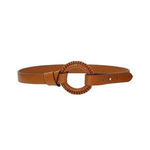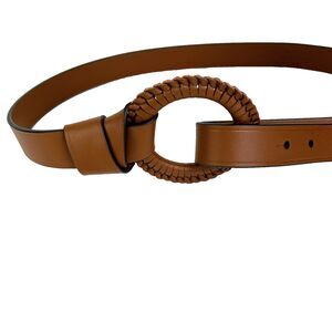 Lauren Ralph Lauren O-Ring Leather Belt in cognac tan brown. This classic designer belt mixes equestrian and boho styling with the woven O shaped buckle and knit detail. Loop style closure with peg and hole fasteners and multiple belt holes for adjustability. 1" width, waist measurements pictured (remember to take into account that the waist loops around to fasten unlike a traditional belt. Brand new without tags, unworn.