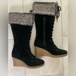 Stylish black lace-up boots with cozy faux fur trim. Perfect for winter fashion. size 7 , 3” heel