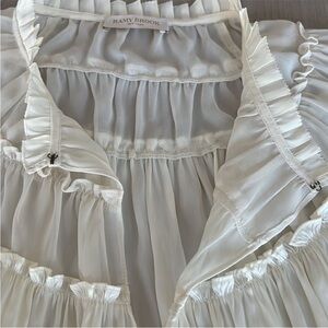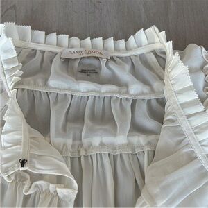 Chic cream blouse with ruffled neckline. Long sleeves with gathered cuffs. Perfect for elegant occasions.