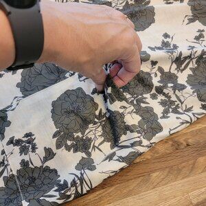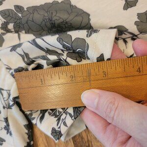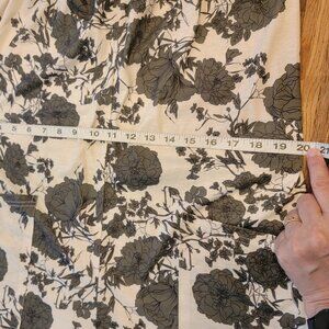 white with dark olive green floral print flowers scattered