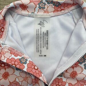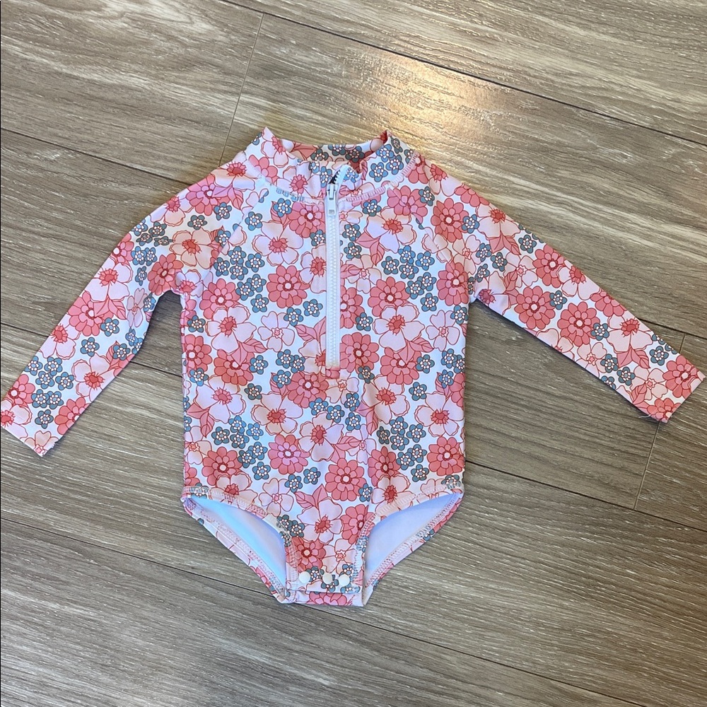 Long-sleeve floral rash guard swimsuit in pink. Provides UPF protection and full coverage for active water play. Front zipper makes dressing easy. Soft, stretchy fabric for comfort and mobility. Stylish pink floral print kids will love.