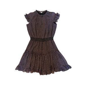 Flirty and feminine, this Rebecca Minkoff floral mini dress features a soft black base with petite pink blossoms, flutter sleeves, and a tiered ruffle skirt. The smocked waist flatters the silhouette, while the lightweight chiffon overlay adds effortless movement. Fully lined for comfort and sophistication — perfect for brunch dates, day-to-night wear, or a romantic getaway look.