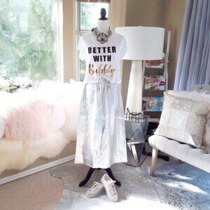 NWOT Rebel Sugar white "Better with bubbly" t-shirt with black & gold print, L