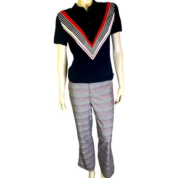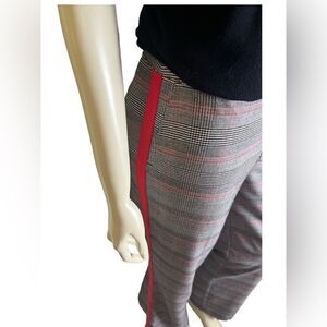 These fun red, black and white plaid wide leg pants feature a red stripe down each leg, from G.I.L.I. (Got It Love It). They are 62% polyester, 36% rayon, and 2% spandex, and are NWOT. The size 6P measures as follows: