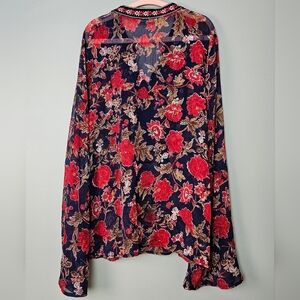 NWOT Red Blue Floral Boho Embellished Sheer Bell Sleeve Top Embroidered Collar M