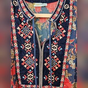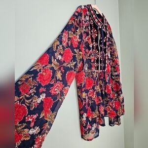 NWOT This top features a relaxed fit with long bell sleeves and a mandarin collar, adorned with vibrant red and pink floral designs. The embellished details add a touch of elegance, making it perfect for a stylish and comfortable look.