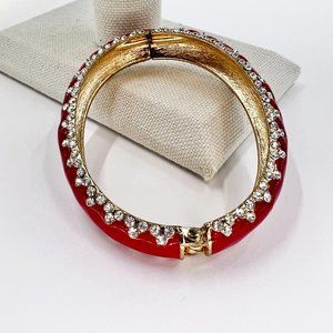 NWOT - Red Enameled Clear Rhinestone Gold Tone Hinge Bracelet. Bracelet is 3” long by 2.5” wide, and is .5” thick. Rhinestones line both sides of the bracelet. Bracelet is new without tags and is in excellent condition.