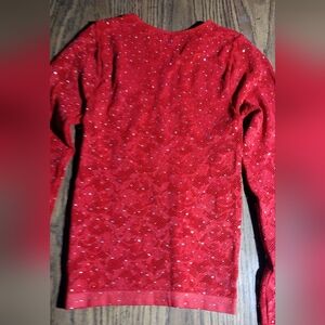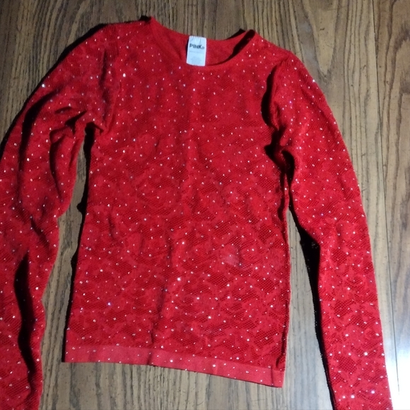 Pink dot size medium. Bright red. Long sleeves. Warm thick mesh fabric adorned with scattered sparkling rhinestones. Nylon/spandex blend. Super stretchy. Wear over a camisole or sports bra. Versatile, good for casual, festive or clubwear. Brand new. Pit to pit measures 13", length 21 1/2", arm 21".