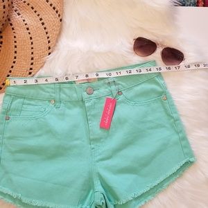 Beautiful Mint color wash denim that's perfect for summer! Missing the sale tag but guess I left on the other tag- never worn. Single button fly highlights the high-rise waist, while while cool cut-off hems complete the cheeky silhouette. No rips, stains or piling. Pet free and smoke free home.