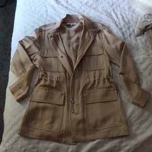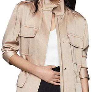 Very sophisticated lightweight Blakely utility jacket by Reiss. Material (details in photo) is not stiff, more soft and flowy. Color is "Neutral" but I would call this a shimmery "champagne pink" color. Never worn. TAGS ARE REMOVED BUT ARE INCLUDED WITH THE ITEM (see photo). Drawstring at waist, front zipper and button closures, faux utility pockets.