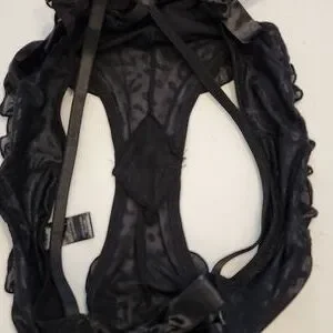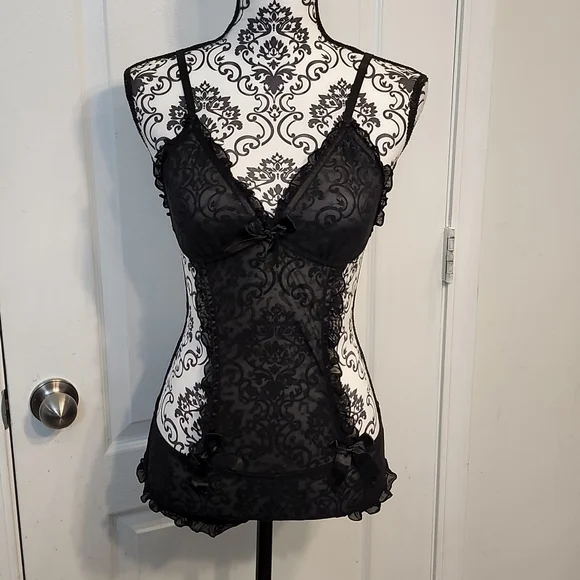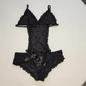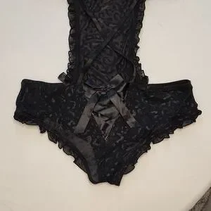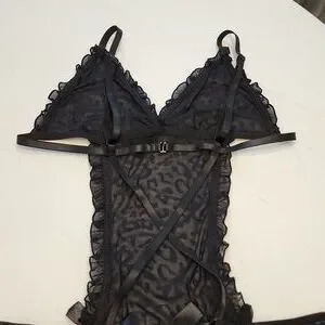 NWOT Rene Rofe Teddy. Sheer Lace with a cheetah like print as shown in pictures. Only tried it on when I bought it. Never worn. Super flattering!! Size M/L. Color is black.