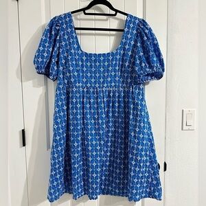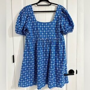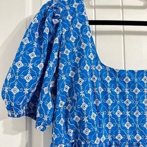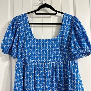 Add bright, timeless style to your warm-weather wardrobe with this Eyelet-Print Mini Dress from RHODE x Target. Adorned with allover eyelet print, this light blue mini dress is made of lightweight cotton for all-day breathable comfort. It's designed with a square neckline, short balloon sleeves and a gathered waist that creates a softly-pleated voluminous skirt.