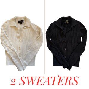 Set of two ribbed cardigans in black and white. Features button-up front and long sleeves. These are perfect for high-waisted jeans or low-rise if you want to show a little skin or a shirt underneath.