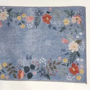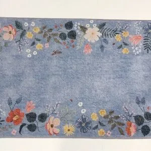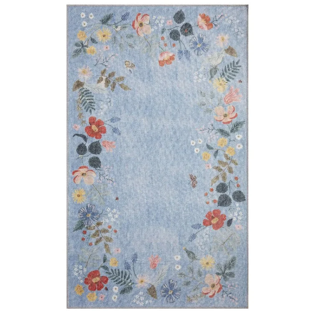 NWT Rifle Paper Co. x Loloi Atelier Strawberry Fields Border Periwinkle Non-Slip Runner Rug. Add a dose of colorful florals to any corner with a rug from our Atelier collection, created with a skid-resistant backer, perfect for in front of the sink or in an entryway. Vivid colors are achieved through printing the design on a powerloomed base. Part of our Rifle Paper Co. × Loloi collection. 2' x 5', 100% polyester, printed power-loomed, skid-resistant backing, 0.19" thickness, bright colors, fine details, and durability are achieved in this rug, which is made of power-loomed polyester and finished with a printed design. Light blue with colorful flowers, strawberries and butterflies. This would be perfect in a little girl's room, nursery, playroom, bathroom, hallway, laundry room, closet, entryway, or anywhere else you can think of! Will be rolled when shipped.