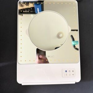 NWOT Riki Loves Riki lighted vanity mirror with LED lights. Sleek white design with touch controls. Missing charging cord but compatible with any USB charging cord. No box.